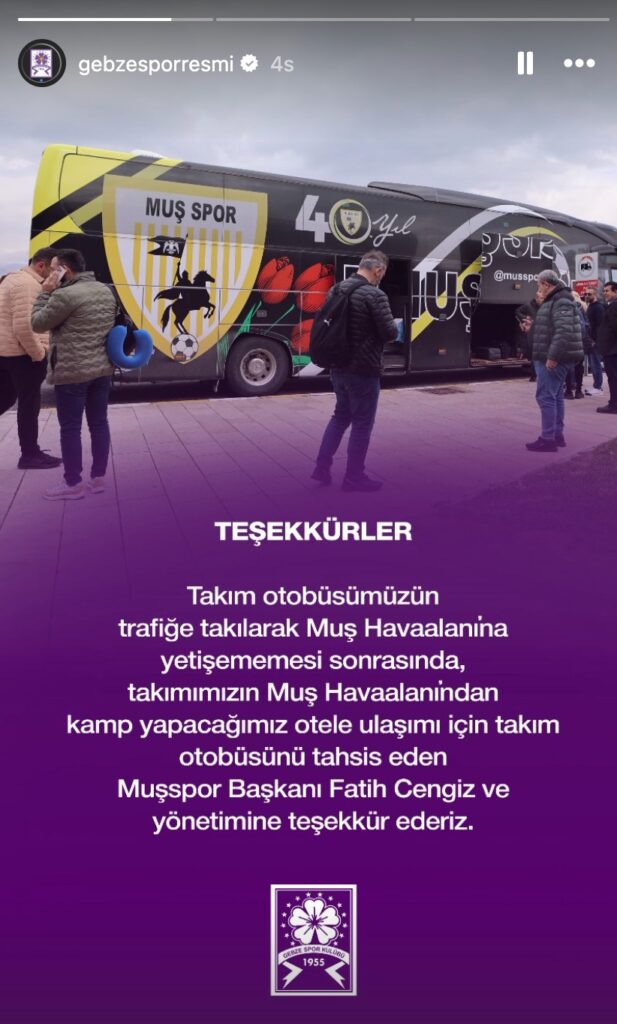 TFF 2. Lig ekiplerinden Gebzespor, Muş deplasmanında yaşanan ulaşım sorunu sonrası Muşspor yönetimine teşekkür etti.