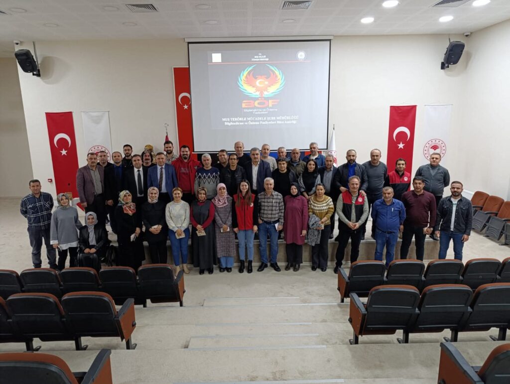Muş İl Emniyet Müdürlüğü Terörle Mücadele Şube Müdürlüğüne bağlı Bilgilendirme ve Önleme Faaliyetleri Büro Amirliği tarafından, İl Tarım ve Orman Müdürlüğü personeline yönelik bilgilendirme eğitimi düzenlendi.İl Tarım ve Orman Müdürlüğü Konferans Salonu’nda gerçekleşen eğitimde, Bilgilendirme ve Önleme Faaliyetleri kapsamında sunum yapılarak, kurum personeline önemli bilgiler aktarıldı.Toplantıya, İl Müdür Vekili Mehmet Gündoğdu, Müdür Yardımcısı Dr. Ferit Yıldız, şube müdürleri ve kurum personeli katıldı. Eğitimin, personelin farkındalığını artırmak ve bilinçlendirmek amacıyla gerçekleştirildiği belirtildi.