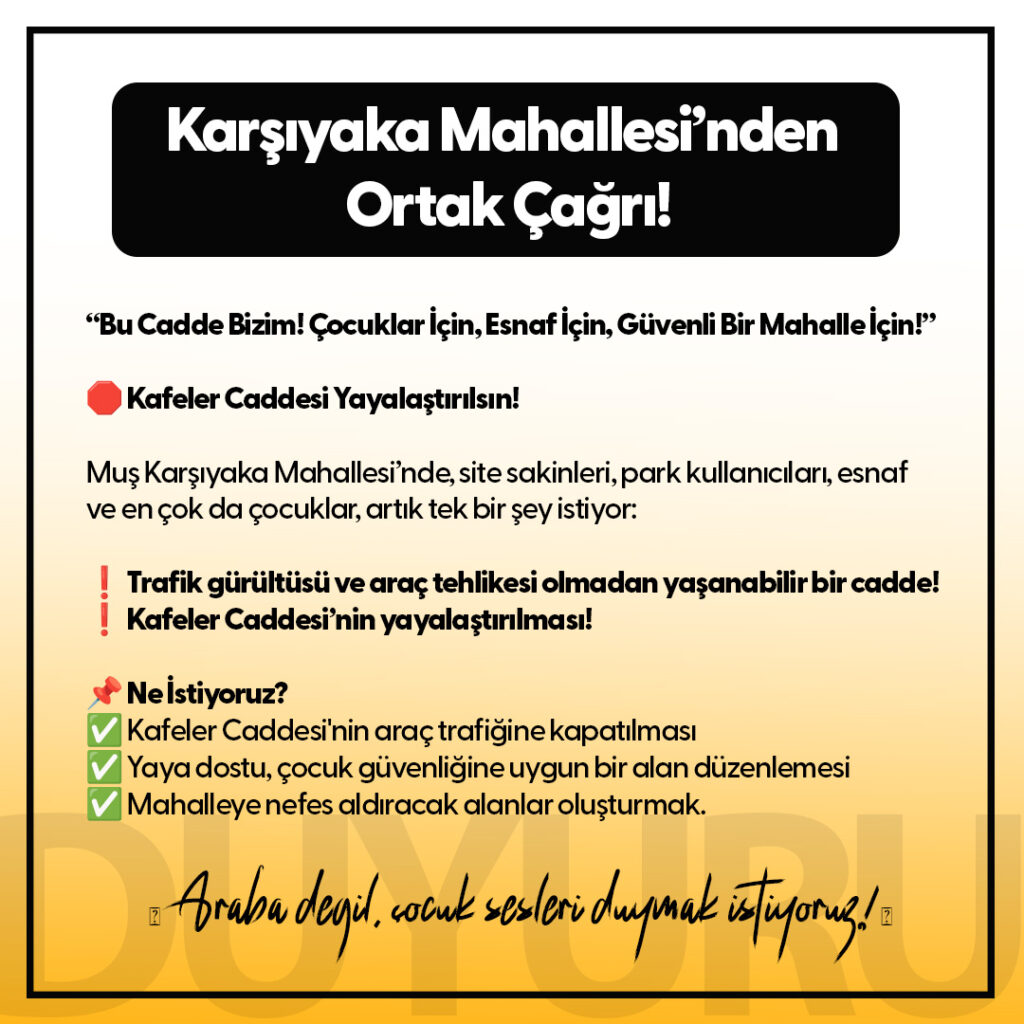Muş merkez Karşıyaka Mahallesi’nde bulunan Kafeler Caddesi’nde yaşayan site sakinleri, yolun trafiğe kapatılarak yayalaştırılmasını talep ediyor. Mahalleli, özellikle çocuklar için ciddi bir güvenlik riski oluşturan bu yolun, Muş Belediyesi tarafından acilen düzenlenmesini istiyor.