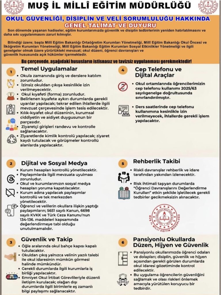 Muş İl Milli Eğitim Müdürlüğü tarafından yayımlanan genel talimatla, okullarda disiplin kurallarının eksiksiz uygulanması gerektiği vurgulandı. Öğrencilerin derslere zamanında katılması, okuldan izinsiz çıkış yapmaması ve belirlenen kıyafet yönetmeliğine uygun hareket etmesi zorunlu hale getirildi. Kurallara uymayan öğrenciler hakkında ilgili mevzuat kapsamında işlem yapılacağı ifade edildi.