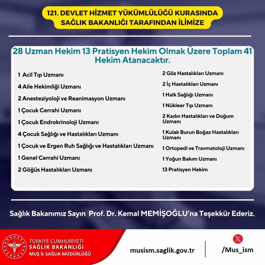 Sağlık Bakanlığı tarafından gerçekleştirilen 121. Devlet Hizmeti Yükümlülüğü Kurası kapsamında Muş’a 28 uzman hekim ve 13 pratisyen hekim olmak üzere toplam 41 yeni hekim atandı.Muş’a atanacak uzman hekimler arasında acil tıp, anesteziyoloji, çocuk sağlığı, iç hastalıkları, kadın hastalıkları ve doğum, göz hastalıkları, genel cerrahi, göğüs hastalıkları, yoğun bakım gibi birçok branşta doktor yer alıyor.Muş İl Sağlık Müdürlüğü, gerçekleştirilen bu atamaların il genelinde sağlık hizmetlerinin kalitesini artıracağını ve vatandaşların sağlık hizmetlerine erişimini kolaylaştıracağını vurguladı. İl Sağlık Müdürlüğü, desteklerinden dolayı Sağlık Bakanı Prof. Dr. Kemal Memişoğlu’na teşekkür etti.Atamaların kısa sürede tamamlanması ve hekimlerin görevlerine başlaması bekleniyor.