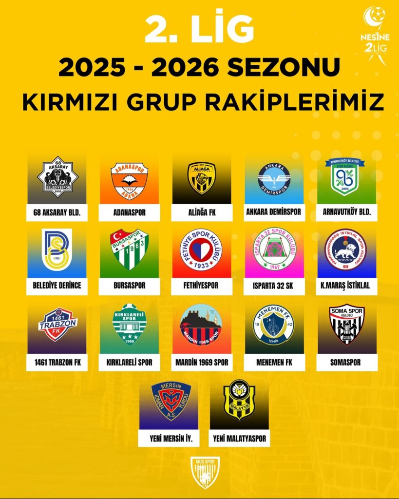 2025-2026 sezonunda TFF 2. Lig’de mücadele edecek olan Muşspor’un rakipleri bugün belli oldu. İstanbul Riva’daki Türkiye Futbol Federasyonu Hasan Doğan Milli Takımlar Kamp ve Eğitim Tesisleri’nde saat 14.00’te gerçekleştirilen kura çekimiyle sarı-beyazlı temsilcimizin yer aldığı Kırmızı Grup şekillendi.