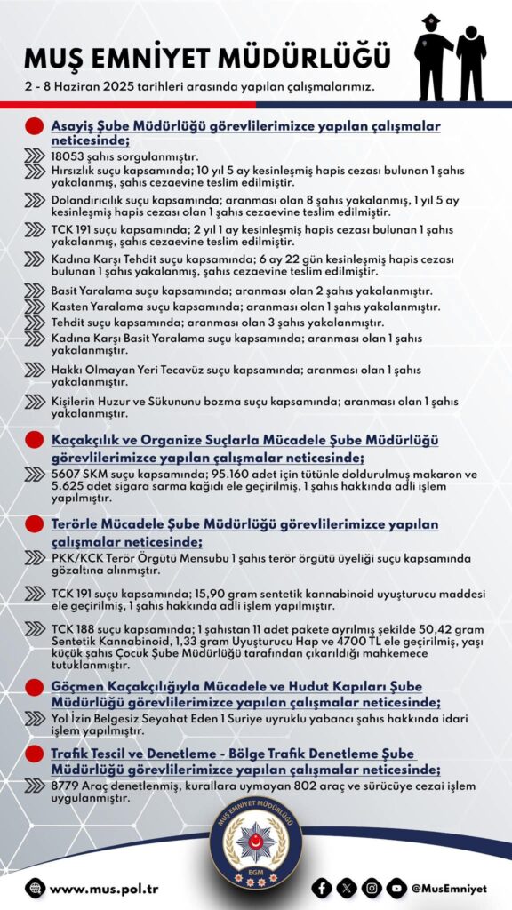 Malazgirt İlçe Emniyet Müdürlüğü görevlilerimizce yapılan çalışmalar neticesinde: