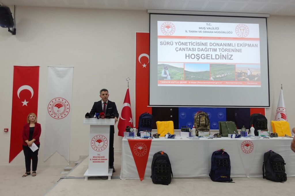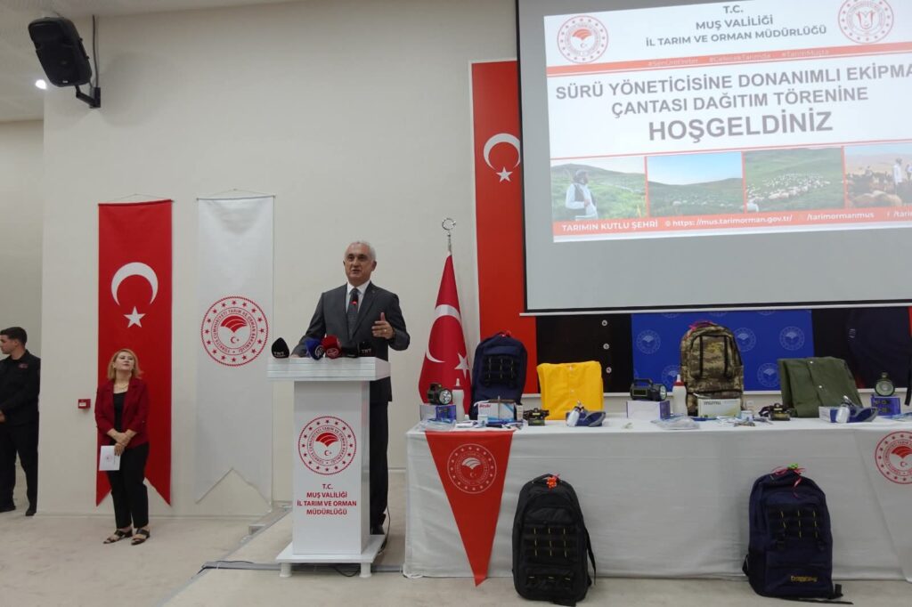 Muş’ta hayvancılıkla uğraşan sürü yöneticilerinin işlerini kolaylaştırmak amacıyla “Sürü Elemanına Donanımlı Ekipman Çantası Projesi” kapsamında ekipman desteği sağlandı. İl Tarım ve Orman Müdürlüğü tarafından yürütülen ve İl Özel İdaresi tarafından finanse edilen proje çerçevesinde, il genelinde görev yapan 413 sürü yöneticisine yüzde 100 hibeli donanımlı ekipman çantası dağıtıldı.