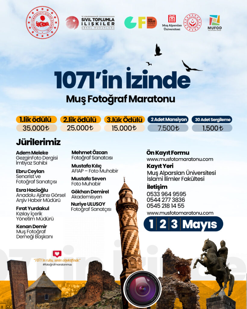 MUŞ – Anadolu’nun kapılarının açıldığı kadim topraklar, bu kez fotoğraf sanatçılarının deklanşörüyle tarihe not düşmeye hazırlanıyor. Muş Valiliği, Muş Alparslan Üniversitesi ve Genç Fikirler Derneği iş birliğiyle düzenlenen “1071’in İzinde Muş Fotoğraf Maratonu”, 1-3 Mayıs tarihleri arasında şehri dev bir açık hava stüdyosuna dönüştürecek.