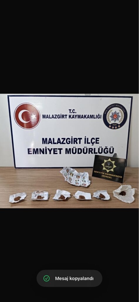 Malazgirt İlçe Emniyet Müdürlüğü ekiplerince yürütülen ayrı bir çalışmada ise metruk bir binada yapılan kontrollerde 6 fişek halinde toplam 18,71 gram sentetik kannabinoid maddesi bulundu. Olayla bağlantılı bir şüpheli yakalanarak hakkında adli tahkikat başlatıldı.